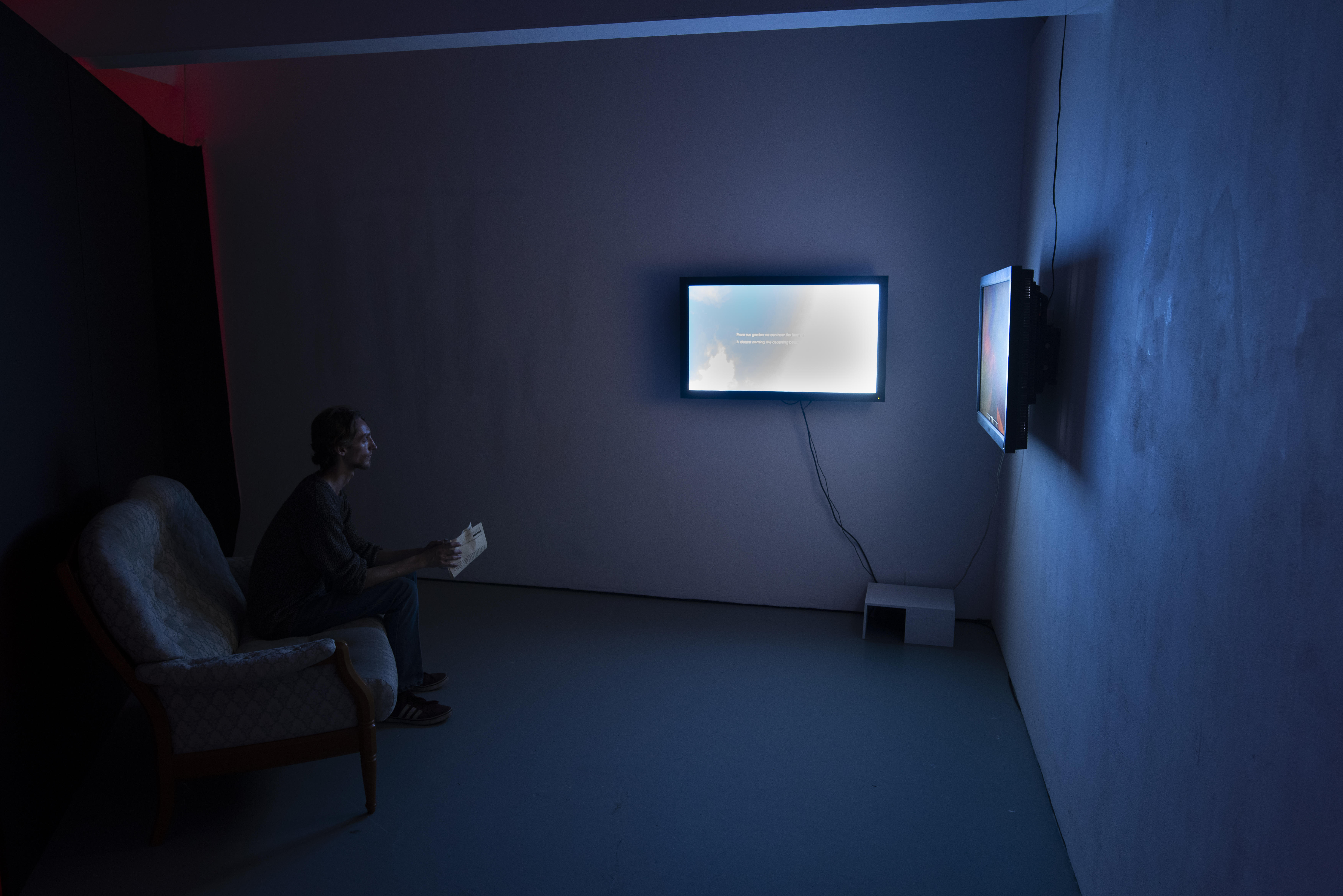 Some Times, 2021, two films of differing lengths play on loop so they continually intersect and respond to each other. Made in collaboration with my 11-year-old twins, but without editing each other’s work. The adult voice is represented by text laid over a film of clouds passing in the sky and shared as a transcription here.